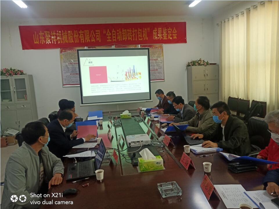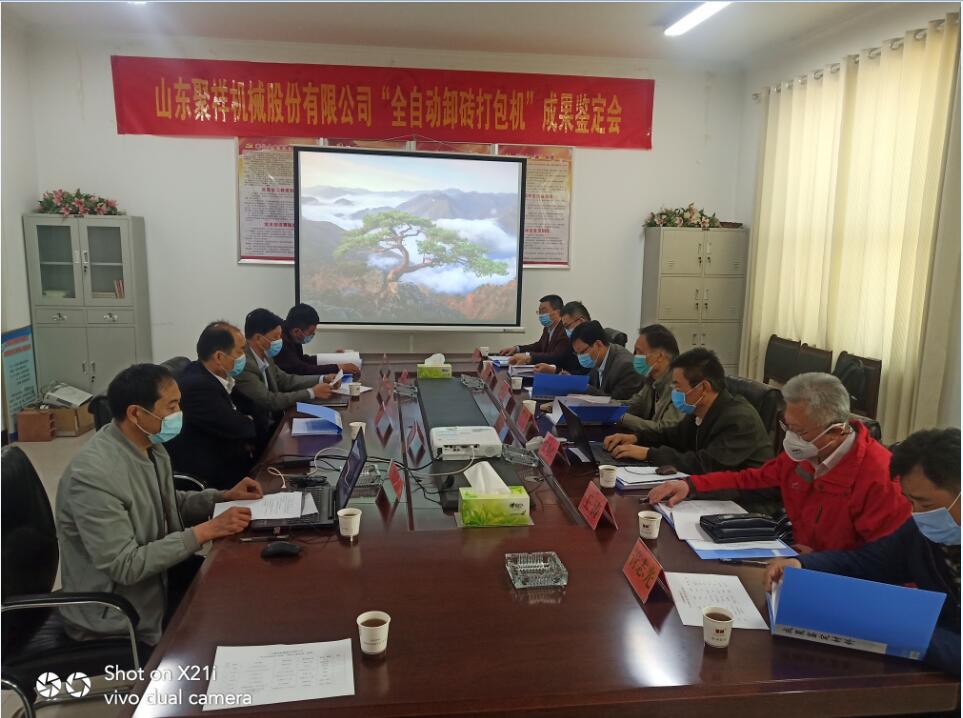 2020年4月28日,菏澤市科技局組織國內知名專家對山東聚祥機械股份有限公司全自動卸磚打包系統進行了科技成果鑒定。與會專家,通過聽取項目匯報、查閱相關資料、觀看全自動卸磚打包系統現場工作視頻,大家一致認為:山東聚祥機械股份有限公司全自動卸磚打包系統整體技術達到國內領先水平,建議進一步提高產品的智能化水平,加大產品的推廣力度。